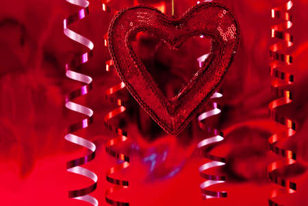 Beautiful festive background with red metallic heart shaped confetti. Valentines day background. Copy space for your text. Selective focus.