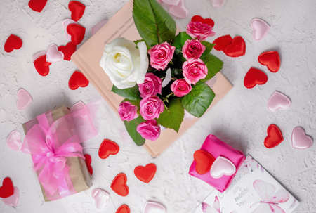 Valentines day greeting card with gift boxex and roses