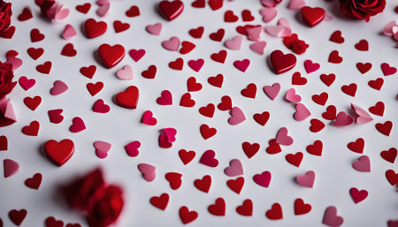 A close-up of a white surface scattered with numerous red and pink hearts, creating a romantic and festive backdrop for Valentine's Day.