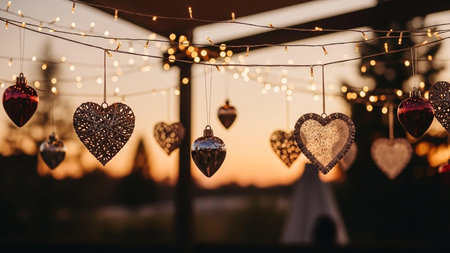 A romantic display of heart-shaped ornaments and string lights against a warm sunset background, perfect for Valentine's Day or wedding decorations.