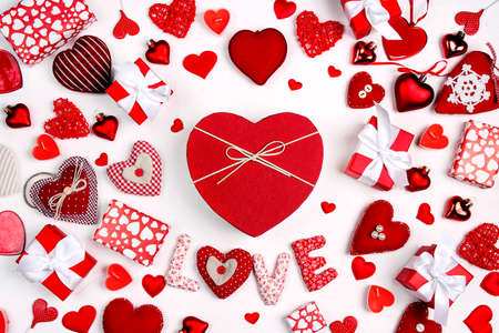Valentine's day composition with gifts, word love and many different hearts on white background. Flat lay, top view.
