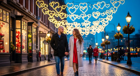 A captivating Valentine's Day window display: heart-shaped decorations, gourmet chocolates, and elegant roses enchant a strolling couple at dusk This romantic scene evokes love and magic, ideal for Valentine's Day social media, websites, and marketing showcasing romantic gifts and getaways AI Generative
