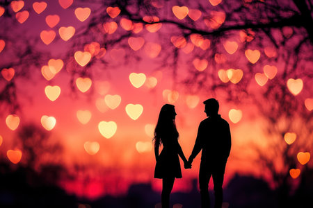 A couple enjoys a romantic sunset walk, their silhouettes highlighted by a vibrant sky and soft heart-shaped lights, exuding warmth.
