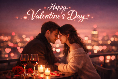 Couple enjoys a romantic rooftop dinner on Valentines Day with candles, wine, and heart decorations in the background amid city lights.