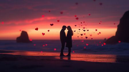 A couple walks hand in hand along a beach at sunset, surrounded by falling hearts.