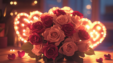 A romantic rose bouquet with a mix of vibrant red and soft pink roses, surrounded by heart-shaped decorations and glowing soft light.