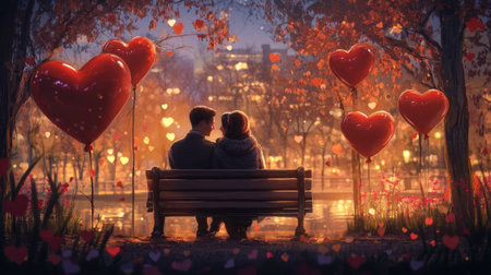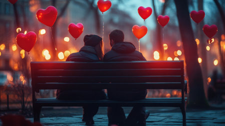A couple sitting on a park bench, surrounded by Valentine's Day decorations, with heart-shaped balloons in the background.