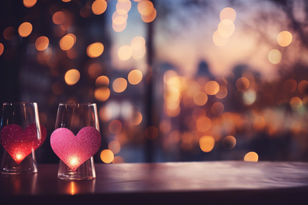 Two wine glasses and two glowing heart-shaped lights on a table, creating a romantic atmosphere for an evening celebration.