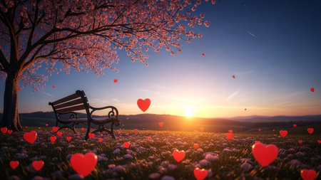 A serene sunset illuminates a park with a bench, cherry blossoms, and floating red hearts, evoking a romantic...