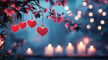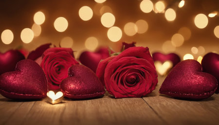A beautiful romantic setting featuring roses, candles, and heart decorations. Perfect for celebrating love and special occasions, creating a warm ambience.