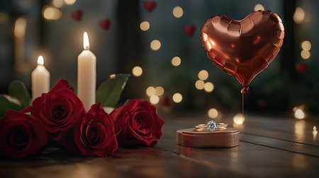 Front view of a romantic Valentine's Day scene with a diamond ring, red roses, candles, and a heart-shaped balloon, close-up and copy space.