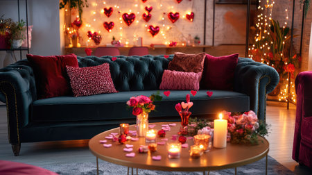 A cozy and inviting living room adorned with heart-shaped decorations, candles, and fresh flowers, perfect for a romantic Valentine's Day atmosphere.