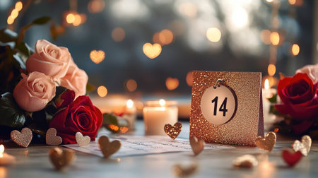A romantic table setting featuring a vintage calendar, fresh roses, and warm heart decorations. Perfect for love celebrations, anniversaries, or special moments.