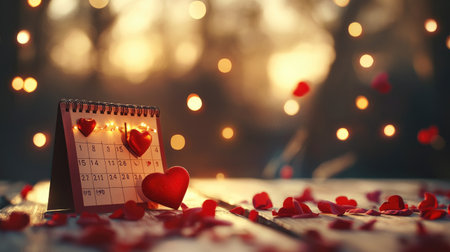 A beautiful still life featuring a calendar beside a bouquet of pink roses and glowing hearts, creating a romantic ambiance perfect for love celebrations.