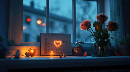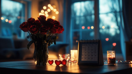 A cozy and romantic setting featuring red roses in a vase beside a calendar and soft lights, creating an intimate atmosphere for love and celebration.