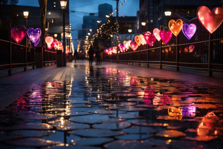 A dark city street with vibrant and colorful big heart decorations on both sides and couples walking. Valentine time. Love. copy space. . High quality photo