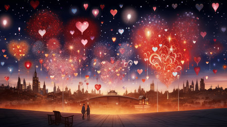 Generative AI Digital illustration of a festive scene with fireworks forming shapes like hearts and stars.