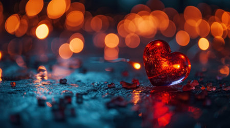 A beautiful composition featuring a red rose and a charming heart, set against a backdrop of soft glowing lights, evoking feelings of love and romance.