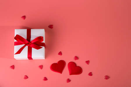 Valentine's Day background with gift box and hearts. Holiday concept. Top view, copy space