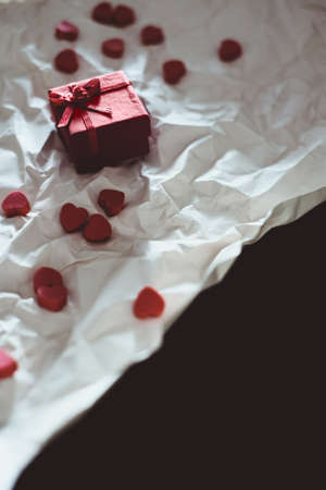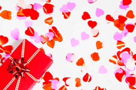 Present box with decorative hearts confetti on white background. Abstract backdrop. Love and romance concept. Valentine day theme. Flat lay style