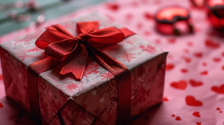 A beautifully wrapped gift with red heart decorations and a satin ribbon rests on a soft surface, bathed in warm sunlight and shadows, ideal for romantic celebrations and special moments.
