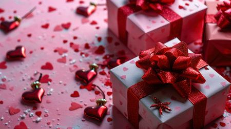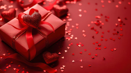A red gift box with a heart-shaped decoration and a red ribbon, surrounded by red hearts and confetti, perfect for Valentine's Day