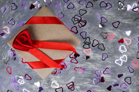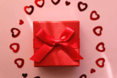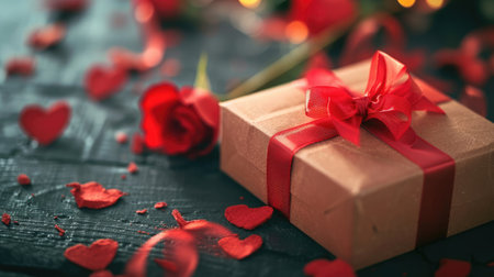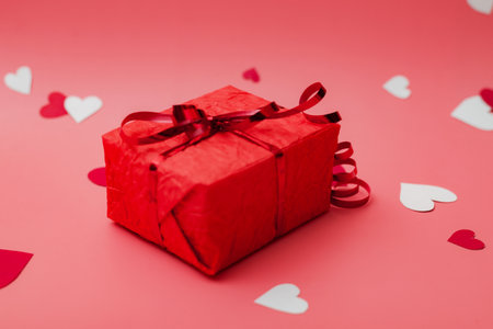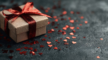 Gift box with red ribbon on dark background surrounded by heart-shaped confetti for celebration