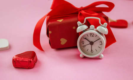 Abstract composition with two decorative hearts and red present box on pink paper background. Valentine day theme. Love and romance concept. Flat lay. Top view