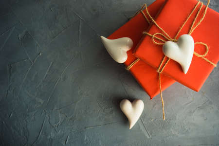 Valentine or other holiday handmade present in paper with red hearts and gifts box in holiday wrapper. Present box of gift on grey cement table top view with copy space, empty space for design.