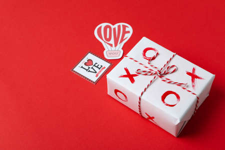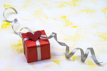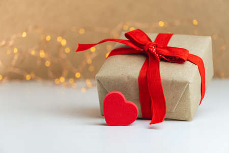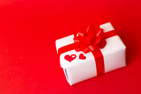Gift or present box with red bow and heart shape on lights background. Copy space for text and design. Valentine day gift. Banner for Christmas, hew year, birthday concept.