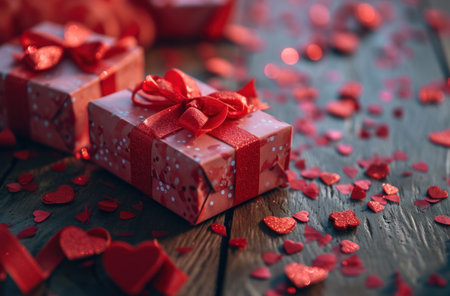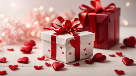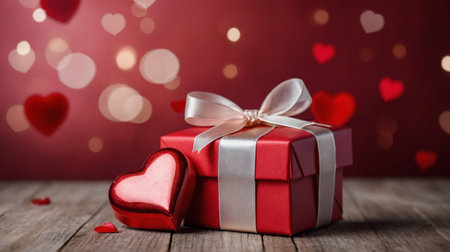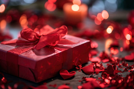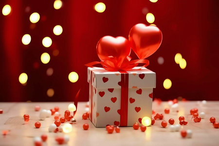 A red gift box with a white ribbon sits on a surface scattered with tiny red hearts, set against a backdrop of blurred red hearts and lights.