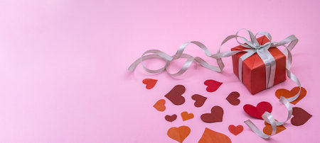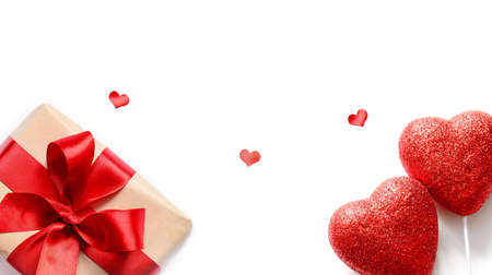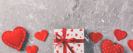 Valentine's Day banner with red hearts and festive box. Flat lay, copy space