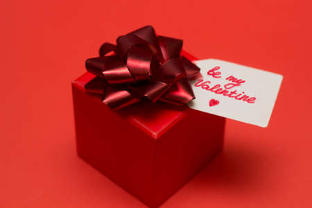 Valentine day composition: red gift box with bow and heart. Christmas present. View from above. Space for text. Holday greeting card.