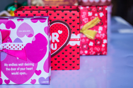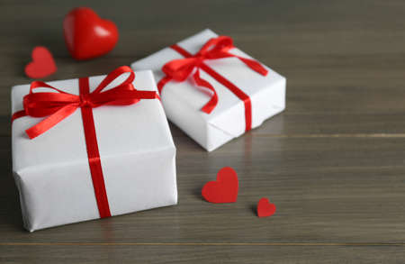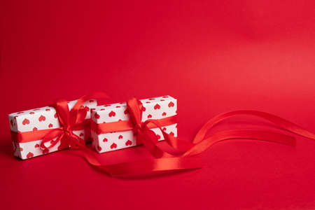 Two wrapped gift boxes in heart shape on red background, Saint Valentine Day