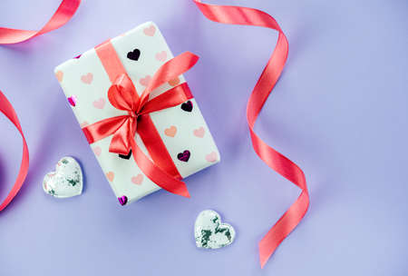 Valentines day gift box with hearts and red ribbon on purple violet background