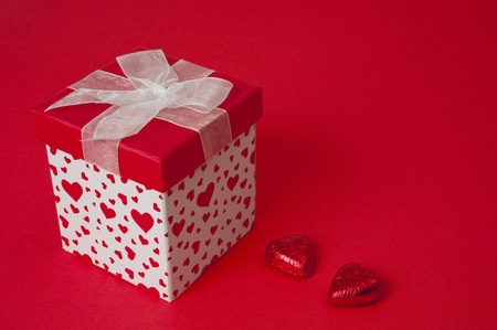 A red gift box with white dots, and a red ribbon, a valentine's day gift
