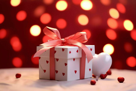 A white gift box with a red ribbon and hearts, sitting on a white surface with a white heart in the background. The background is blurry and red with lights.