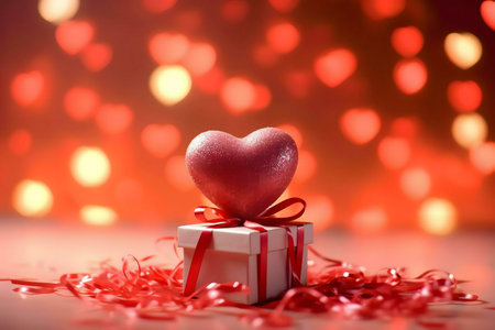 A beautifully wrapped gift box with a heart-shaped decoration, surrounded by glowing lights and glitter hearts, perfect for romantic celebrations or special occasions.