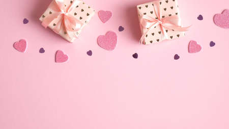 Valentine's day frame border of gifts and heart shaped decorations on pink background. Flat lay, top view. Creative design for party invitation, banner, greeting card. Love and romance concept.