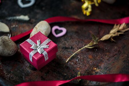 Abstract composition with two decorative hearts and red present box on colorful background. Valentine day theme. Love and romance concept. Flat lay. Top view