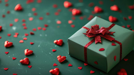 Green gift box accompanied by festive red hearts on a green backdrop. Conceptual gift for Valentine's Day, Weddings, or Birthdays, viewed from the side, Ai Generated