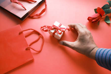rose background, birthday gift, gift in red packaging with silver-gray ribbon, valentine's day accessory, valentine's day, give a gift