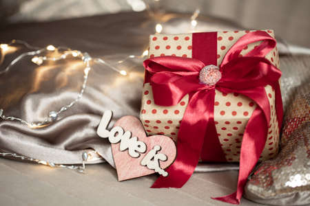 Gift box Packed in paper and tied with a red ribbon with a bow in the shape of a rose on a pillow.