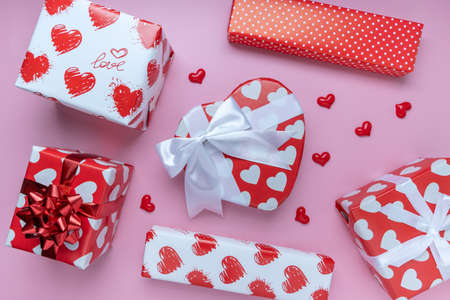 red heart shape Gift or present box, mini heart on pink background. for banner. The concept of Valentine Day. top view, copy space