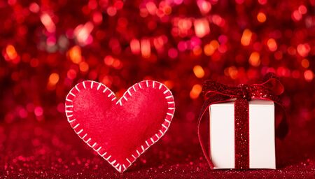 Handmade felt heart and a gift for Valentine's Day on a sparkling red background