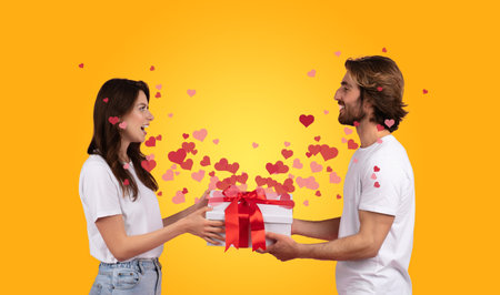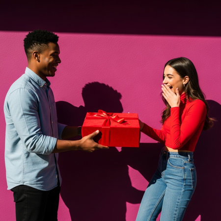 Couple sharing a gift on Valentines Day with affection and joy