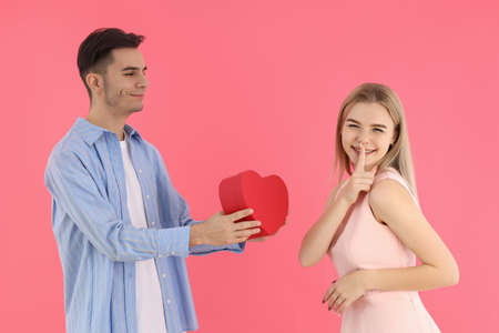 Valentine's present. Man in love, giving present box to his girl in shape of heart