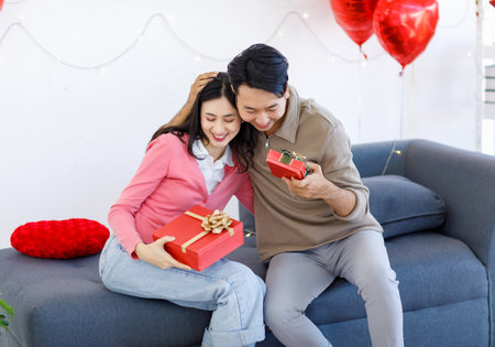 Millennial Asian young romantic lover couple male boyfriend sitting on cozy sofa giving present wrapped gift box surprise female girlfriend celebrating valentine day festival in decorated living room