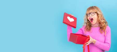 surprised adult woman with gift box isolated