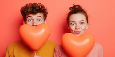 Young couple holding heart-shaped balloons, making playful surprised faces and celebrating love and affection against a vibrant orange-pink studio background, joyful and flirty